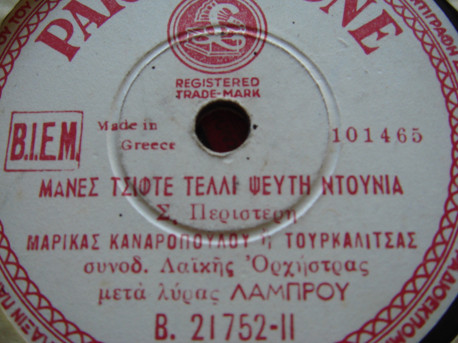 Κοιτώντας τους δίσκους πριν την "Μουχλιασμένη Ταβέρνα" βρήκα τον παρακάτω δίσκο που είναι κοντά στα κριτήρια που έθεσα. Είναι ο δίσκος Β-21739 με το κομμάτι του Ζαχαρία Κασιμάτη "Δεν με τουμπάρεις" με την Μαρίκα Πολίτισσα με αριθμό μήτρας 101443.