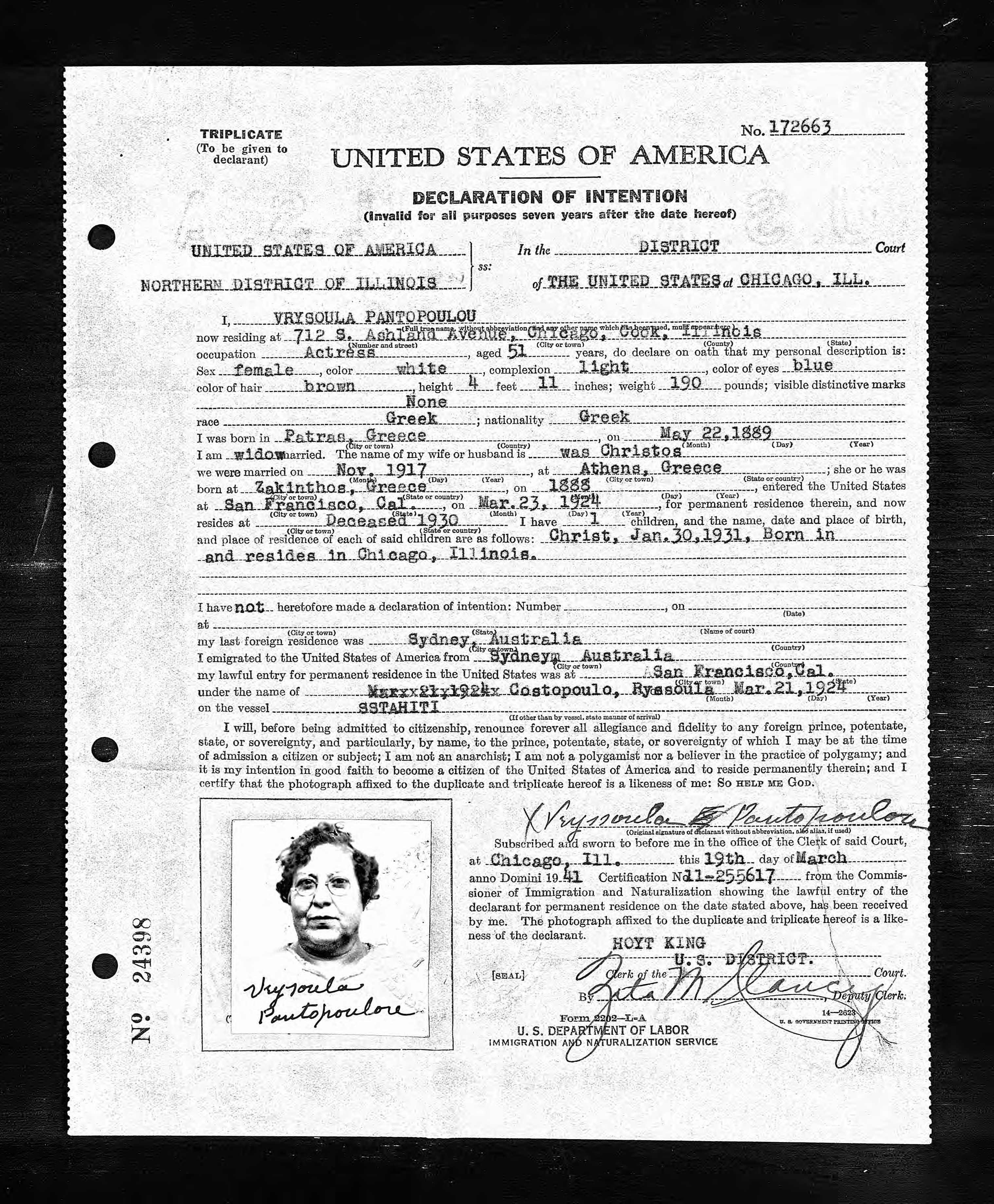Και η αίτηση πολιτογράφησης της Παντοπούλου το Μάρτιο του 1941 στο Σικάγο (περιλαμβάνει φωτογραφία της) :