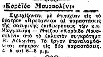 Οι στίχοι του Γιώργου Οικονομίδη πάνω στην μουσική του Di Lazzaro, έδωσε την έμπνευση στο πολυτάλαντο Κωστή Μπέζο, με την ιδιότητα του θεατρικού συγγραφέα, να γράψει με την βοήθεια του Μαγγανάρη, την πολεμική επιθεώρηση «Κορόϊδο Μουσολίνι» σε μουσική Κατριβάνου. Πρωταγωνιστής στο θεατρικό σανίδι ήταν ο Βασίλης Αυλωνίτης με τον θίασο του.